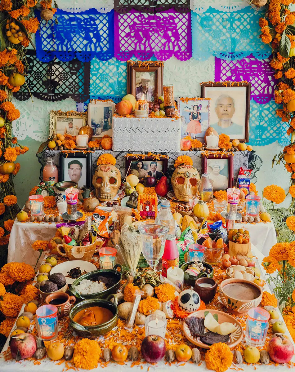Altares u ofrendas: Se elaboran con niveles que simbolizan el mundo terrenal y el espiritual. Incluyen fotografías de los difuntos, flores de cempasúchil, veladoras, pan de muerto, calaveritas de azúcar y objetos que fueron significativos para quienes se recuerda.