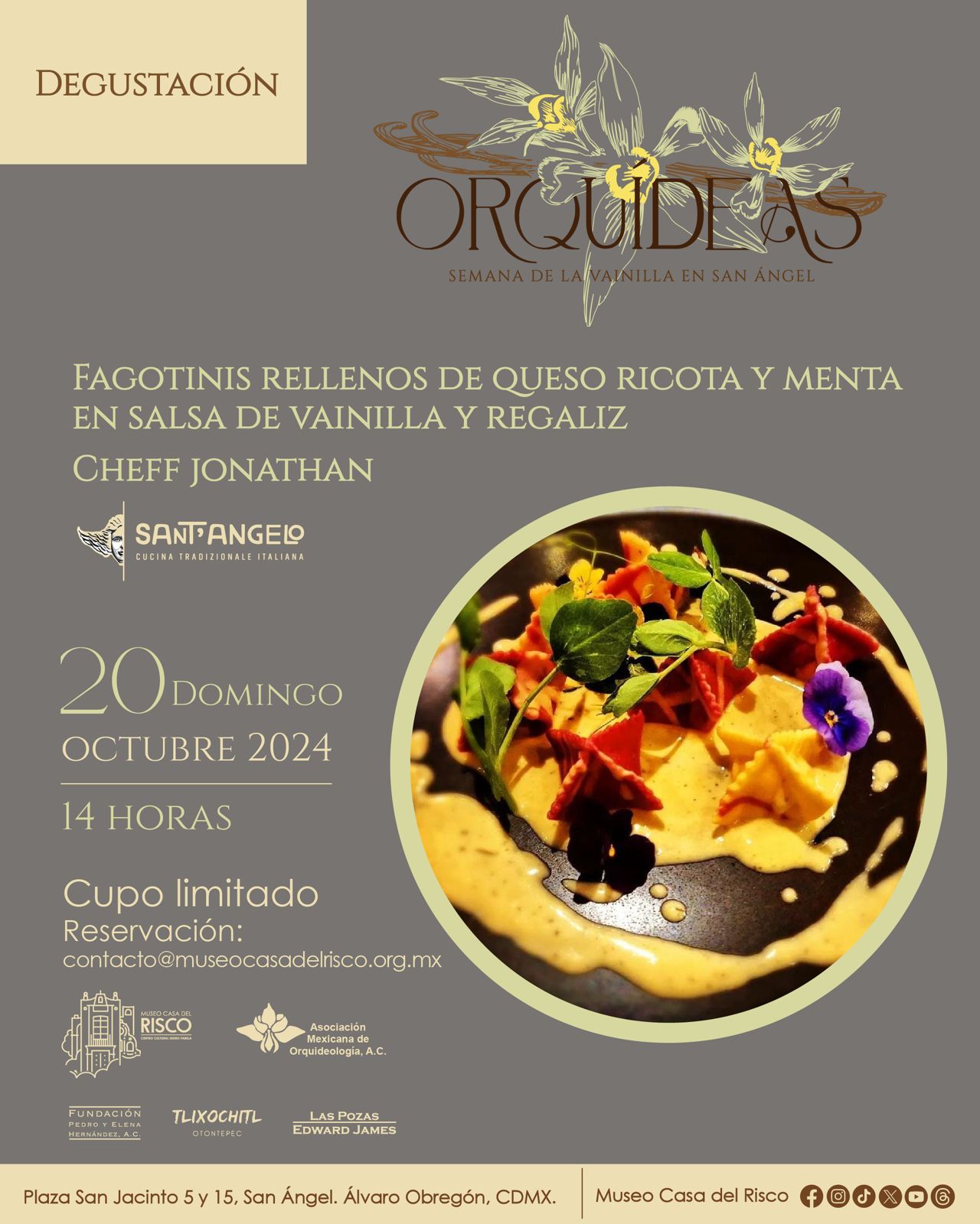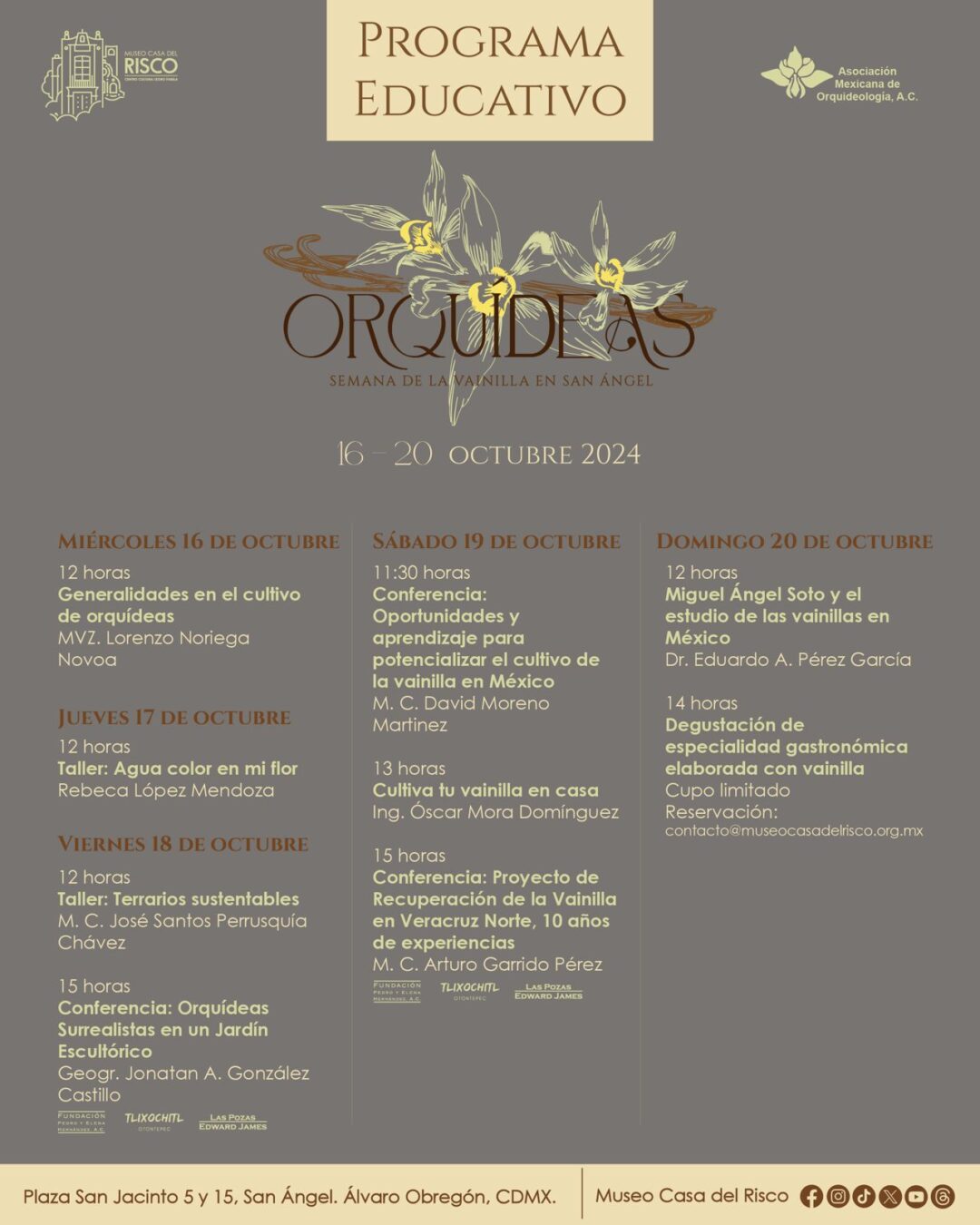 Del miércoles 16 al viernes 20 de octubre se llevará a cabo el Festival Orquídeas. Semana de la Vainilla en San Ángel, donde se celebra la diversidad y belleza de estas magnificas plantas. El programa de actividades incluye exposición y venta, charlas y talleres. Para este evento, el Museo Casa del Risco cuenta con la colaboración de la Asociación Mexicana de Orquidelología, A.C.